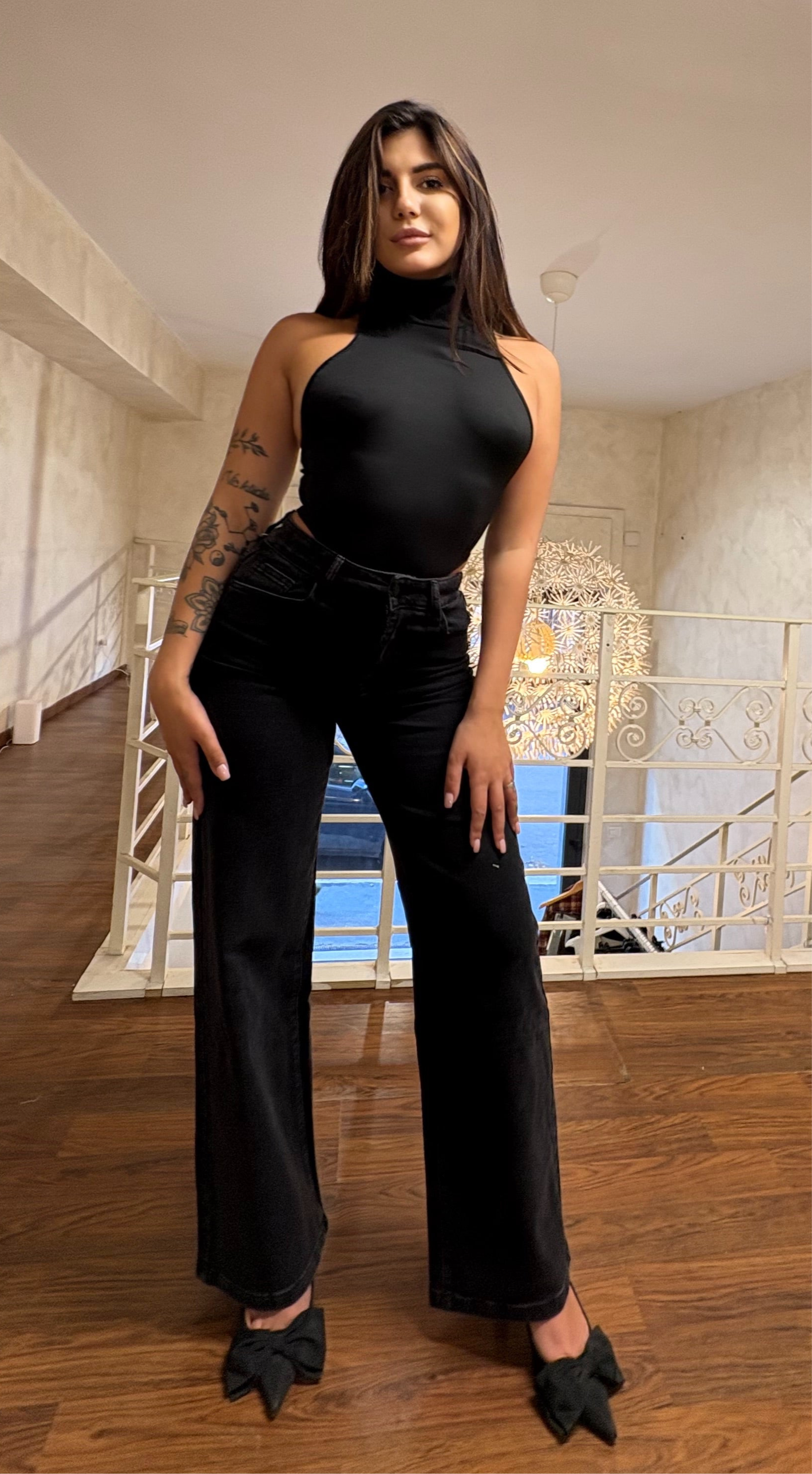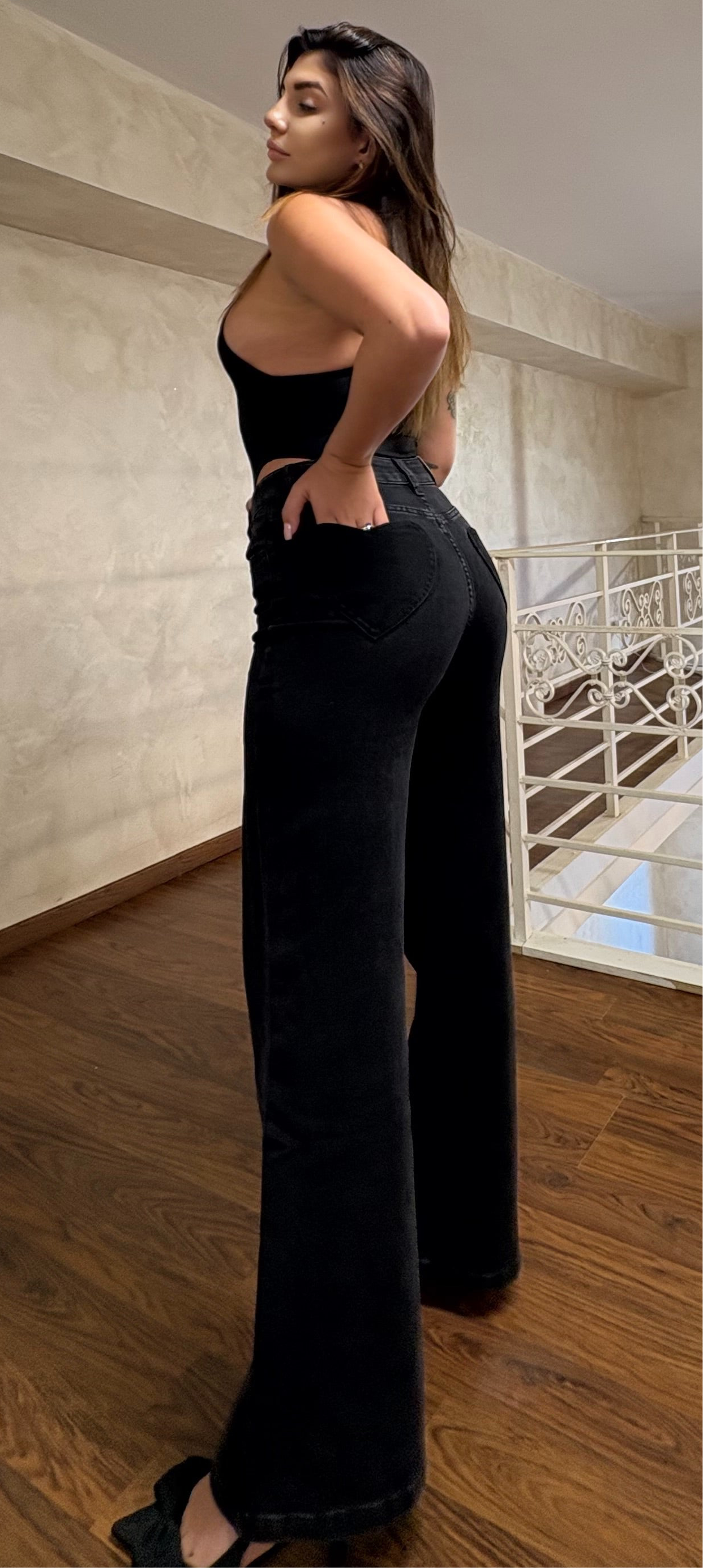 Jeans nero con tasche a cuori, vita alta dritto sulle gambe.