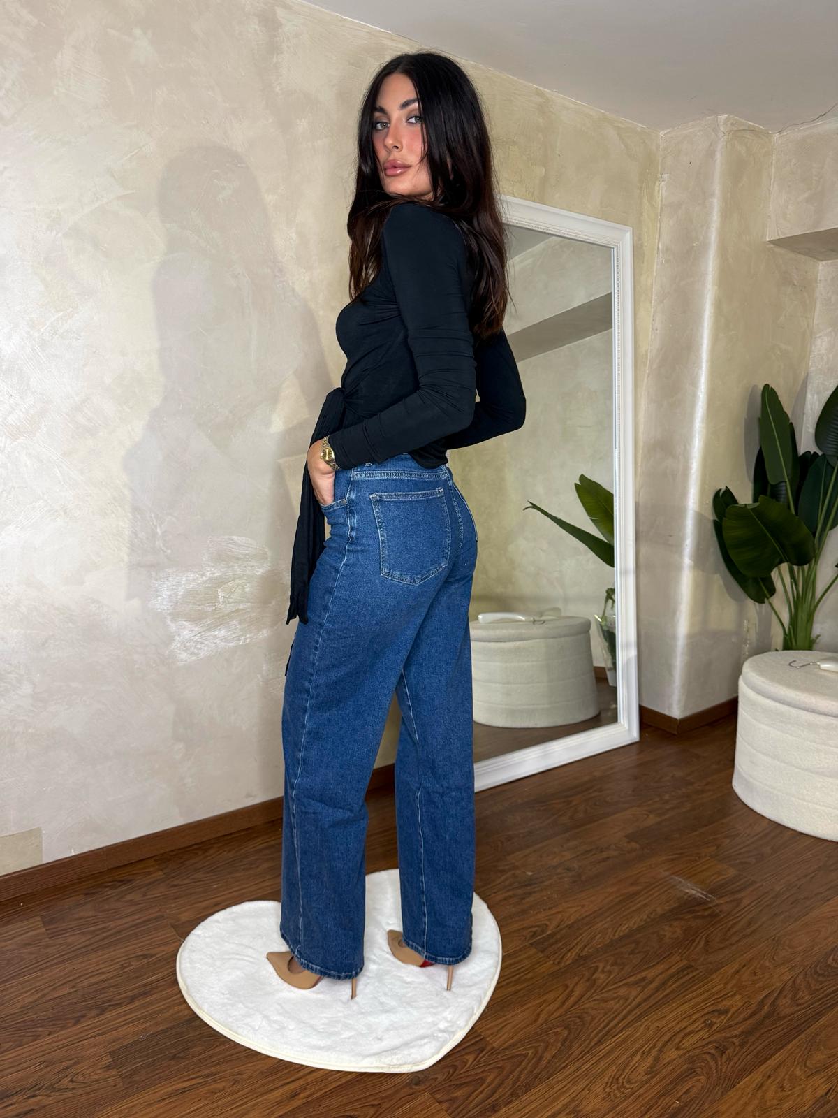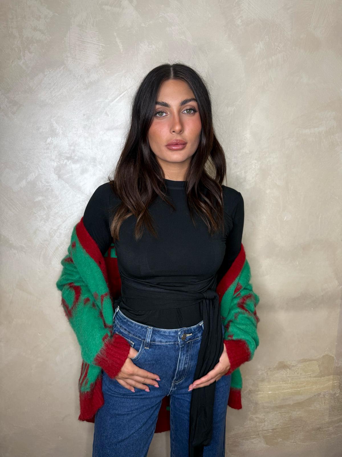 T-shirt nera, manica lunga, dettaglio fiocco davanti o dietro